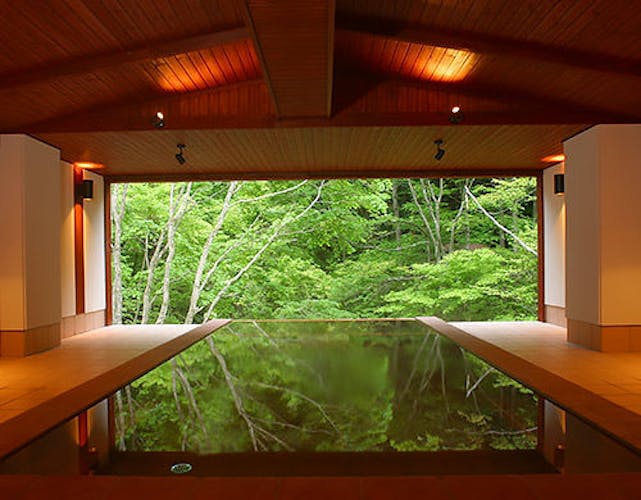 目の前に広がる自然と一体になれる「立ち湯 雪月花」。四季折々、様々な表情を楽しむことができます。