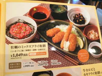 ●牡蠣のミックスフライ和膳(ミニまぐろご飯)1049円(税抜)