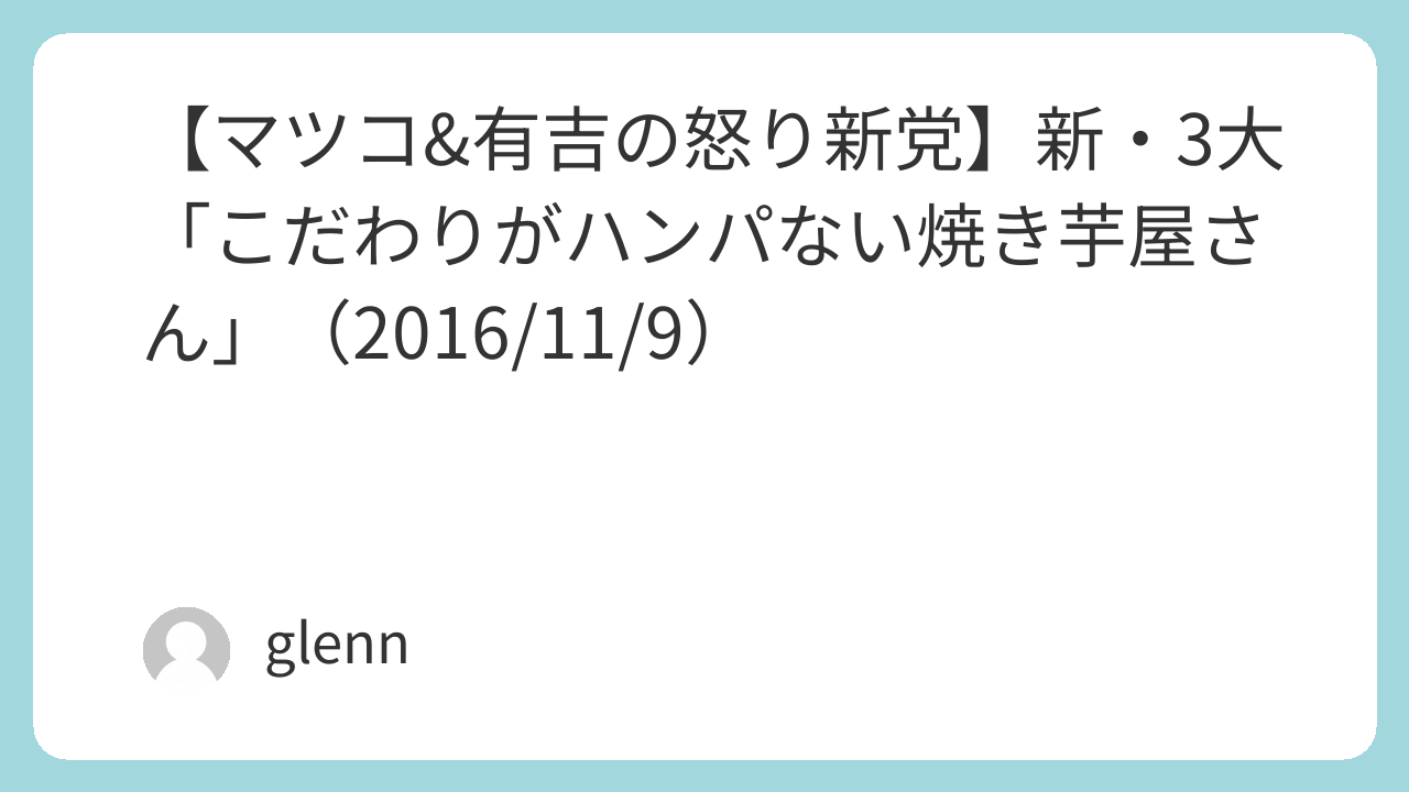 2016年11月9日の『マツコ&有吉の怒り新党』『新・3大○○』のコーナーは「こだわりがハンパない焼き芋屋さん」。紹介されたお店はこちら!