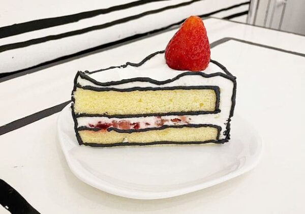 普通のショートケーキを食用の竹炭パウダーの入ったクリームで縁を強調したケーキ。