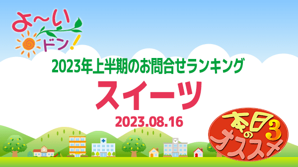 2023年8月16日の『よーいドン!』本日のオススメ3は、上半期総集編 ~夏休みスペシャル2023~!今日のテーマはスイーツ。紹介された情報をまとめました。詳しくはこちら!