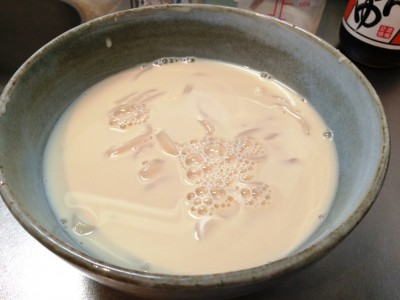 ・器に豆乳・麺つゆを入れます。これだけでもう美味しそうな匂い♪