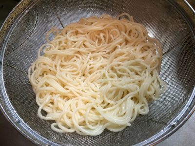 3.麺が茹で上がったらざるにあげ、冷水で軽く洗う