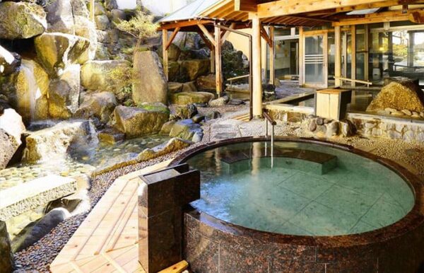 脱衣所から滝が見える贅沢な仕様で、滝を眺めながら入浴できる絶景露天風呂。