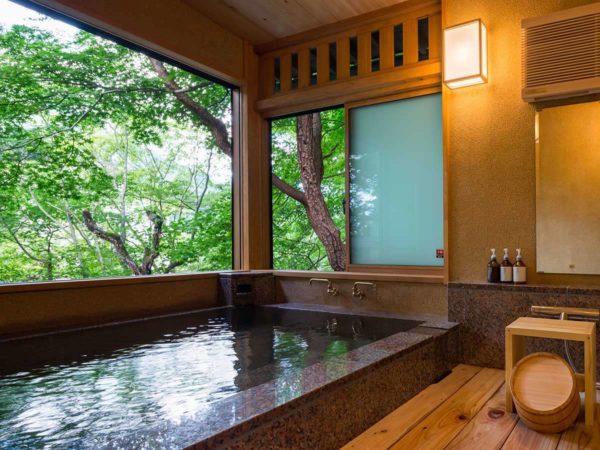 源泉掛け流しの半露天風呂が付いた「和洋特別室」は2015・2017年にリニューアル済み。