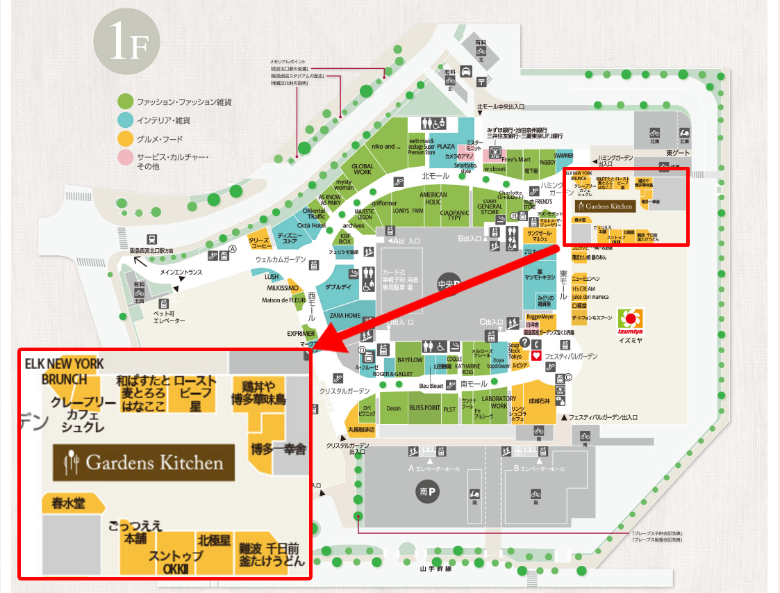 フードコート【ガーデンズキッチン(Gardens Kitchen)】の場所は今までと同じ。1階東モール、イズミヤの隣です。