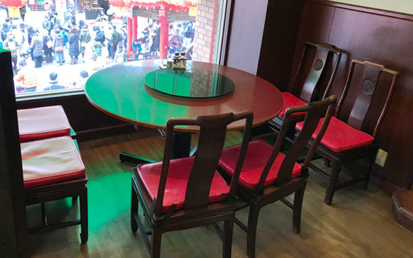 4人掛けのテーブル席と大人数用の丸テーブル席があります。南京町広場が見える窓際にも円卓があります。