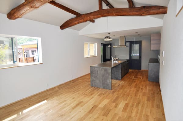 昔の松の梁をそのまま使用。床には天然の無垢材を使用しています。