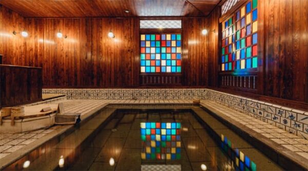 明治時代の共同浴場を復元した建物は、当時最先端だったステンドグラスが湯船に鮮やかな光をおとし、幻想的な雰囲気に。