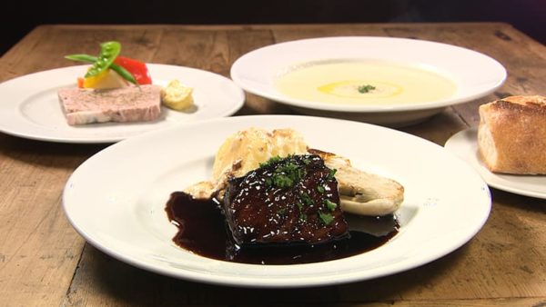 お店の名物料理。牛ほほ肉をワインと香味野菜で煮込んで煮詰めバターで仕上げた逸品。