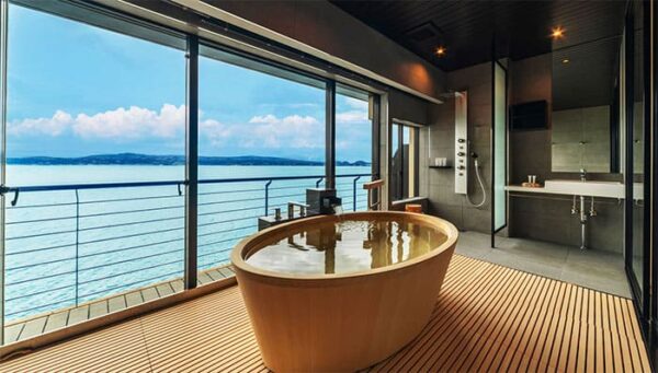 檜の露天風呂付き特別室。目の前に広がる七尾湾の絶景を楽しみながら天然温泉に入れる。