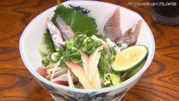 使用するのは地元・黒潮町産のウルメイワシ。塩で下味をつけ、おろし生姜・白胡麻・玉ねぎ・刻みねぎの薬味を添え、鯵の決め手となる自家製醤油ダレで味付けした一品。