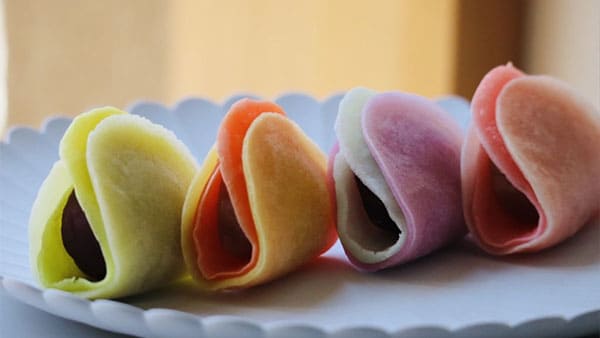 しかも「映える」和菓子は「くまもなか」だけではありません。カラフルな「包み餅」は、ピンク・緑・オレンジ・紫など、まるでマカロンのようなかわいらしさ。もちっとした食感の薄い生地を鉄板で焼き、こし餡と白味噌きな粉を包んでいます。
