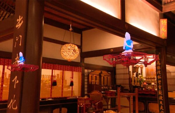 お迎えの様子をドローンを使って表現。ドローンの上に乗っているのは菩薩様。