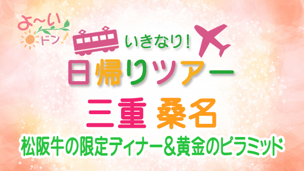 2024年1月30日の『よ~いドン!』「いきなり!日帰りツアー」は三重・桑名。松阪牛の限定ディナーや黄金のピラミッドなど、訪れたスポットや食べたグルメなど、紹介された情報をまとめました!