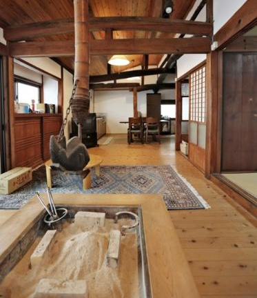 梁から鉤(カギ)を吊るしたこだわりの囲炉裏も。フローリングは木目が美しい無垢材。
