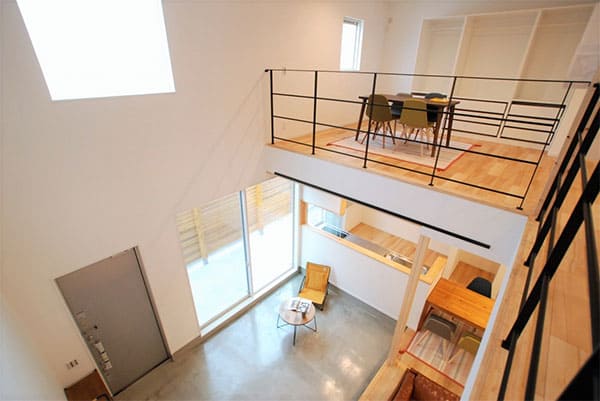 自転車も入れられる土間リビングは天井が吹き抜けになっているので開放感も抜群。