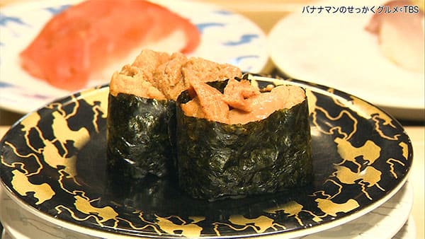 タイ・ヒラメ・のどぐろなど8種類ほどの切り落としを細かく刻み、納豆・たくあん・大葉と一緒に混ぜた軍艦。日本海の海の幸を一つの軍艦で味わえる売り切れ必至の人気メニュー。