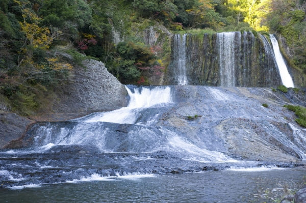 筑紫溶岩台地が削られてできた、落差26m・幅40mの二段になった滝。