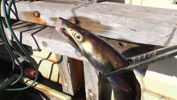 中津のブランド「つの字鱧」。由来は市場で使うトロ箱に入れると「つ」の字になってしまう程大きいことから名付けられた。