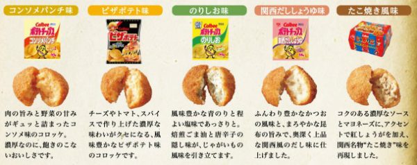 関西しょうゆ味、コンソメパンチ味、のりしお味、ピザポテト味、たこやき風味の5種類