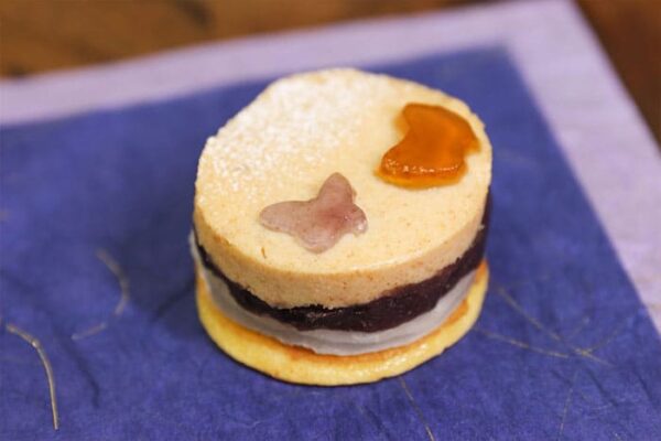 デコレーションされた華やかなどら焼きは、ポエムのように可愛らしい名前が付けられた和スイーツ。濃厚で香り深い宇治抹茶ムースを挟んだどら焼きは、静かな湖畔で咲く花『湖畔に花一凛』。紫芋を練り込んだ白あんのムースは、夜明けに揺れる藤『あけほのの藤紫』。求肥と甘さ控えめの小豆餡が絡み合い、まるで蝶が羽ばたく『月夜に舞う蝶』。