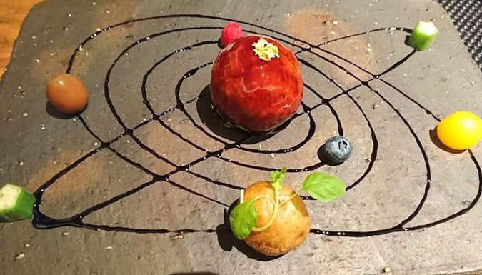 メニューはとにかく独創的。看板メニューの「五川麻婆豆腐」をはじめ、「遊園地のような油淋鶏」は、ティーカップに入った野菜たっぷりの油淋鶏が、ターンテーブルの上をグルグル。「プラネタリウムのような酢豚」は、太陽系の地球が肉団子、太陽がオレンジトマト、水星がブルーベリー、木星がうずら卵と、素材を惑星に見立てています。