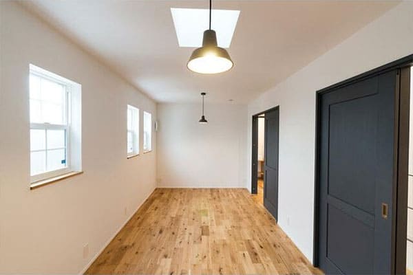 洋室<9.8帖)。勾配天井で開放感&天窓で明るい!入口が2つあるので区切れる間取りになっています。