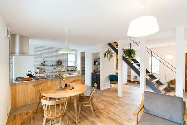 リビングダイニングキッチンは16帖。床は足に優しい無垢材、壁には調湿効果&耐久性がある自然素材の漆喰を使用。