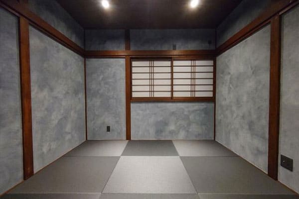 和室(6帖)。畳は琉球畳。壁はジョリパットという塗装剤に炭を実際に混ぜて塗装。