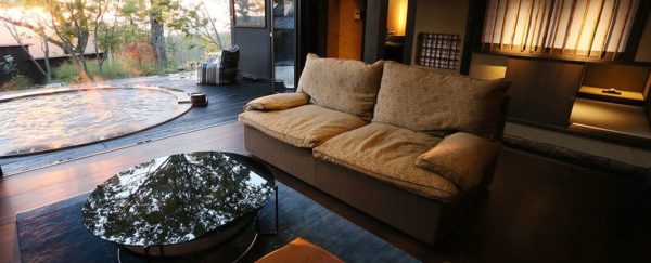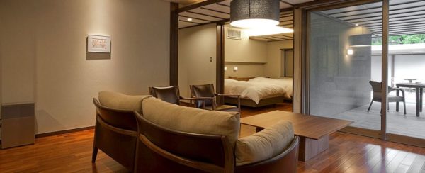 3500坪もの広大な敷地内に部屋数はたったの17室。全6タイプの客室には源泉掛け流しの温泉ビューバス付き。