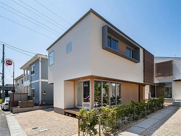 家の前には車2台が止められる駐車場を完備。電気自動車の充電設備もついています。