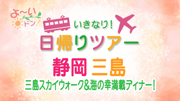 2023年9月19日の『よ~いドン!』「いきなり!日帰りツアー」は静岡・三島。三島スカイウォーク&海の幸満載ディナーなど、取り上げられた情報はこちら!