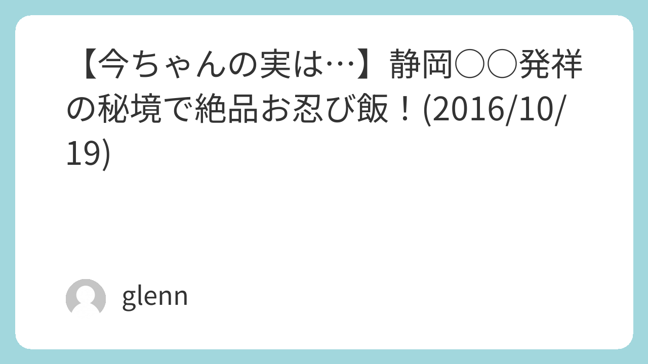 10月19日の『今ちゃんの実は…』はダイアンのコーナー“お忍び飯”シリーズ。今回は「実は…鎌倉時代に伝来した静岡○○発祥の秘境に絶品お忍び飯の名店があった!?」。