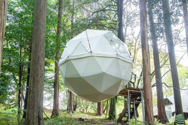 森にひっそり浮かぶ「球体テント」のほか、「グランピング・テント」とコテージタイプの「宿泊棟」が用意されている。