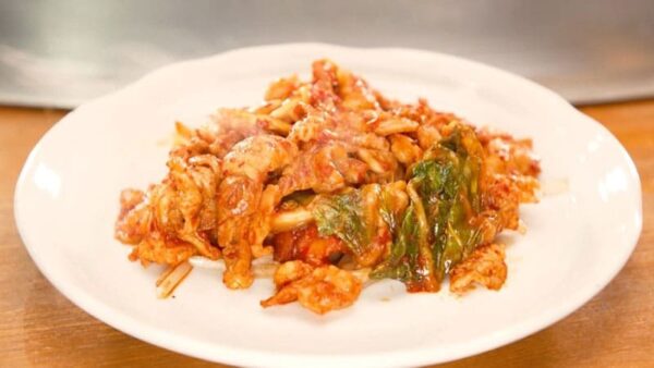 使用するのはご主人が厳選したしっかりした辛さの熟成キムチ。ごま油で炒め、コクと風味を引き出したら脂の甘い国産豚バラ肉と合わせて完成。