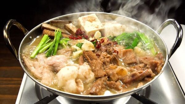 具材と特製もつ煮込みを合わせ、爽やかな香りと程よいシビレが特徴の四川産花山椒をたっぷりとかけ、鰹出汁を加えて煮込んだもつ鍋。