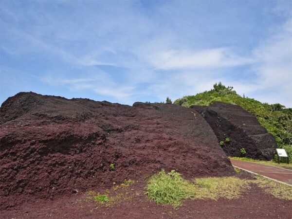 三原山の噴火によって北東の山すそにマグマのしぶきが降り注ぎ、地表を黒い火山岩が覆った圧巻のスポット。