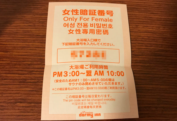女性用へは入口横でパスワードを入力しないと入れないようになっています。(チェックイン時に暗証番号が書かれた紙が渡されます。)