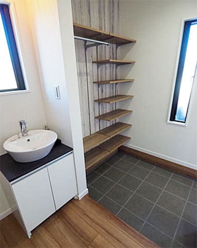 そしてこの物件のポイントは、玄関の横にあるアウトドアストッカー(5.5帖)。外とつながっている土間収納になっていて、収納はもちろん趣味の部屋としても使えます。ガレージ式になっているので、子どもの遊び場やDIYスペースなど、使い方は無限大!