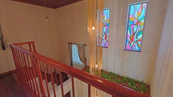 2階に上がる階段の吹き抜けには立派なシャンデリアが。ステンドグラスもステキ♪