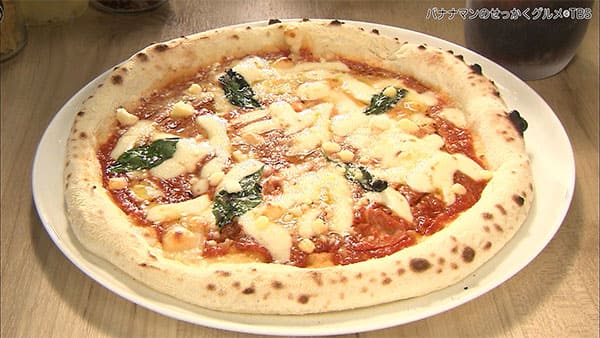 生地は力を入れず優しく伸ばすことで十分に空気が含まれ、モチモチ食感に。お店でブレンドした特製トマトソースと、イタリアからわざわざ取り寄せたモッツアレラチーズをたっぷりのせ、ピザ焼き専用の釜で高温で焼き上げる。焼き時間はたったの1分30秒。焼き時間を極力短くすることで生地に水分がの起こり、サクサク・モチモチ食感に。