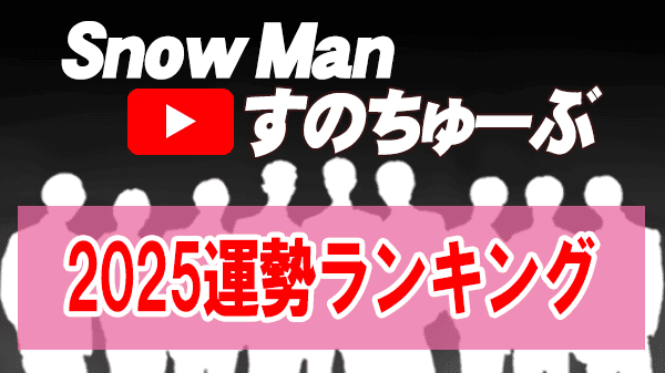 2025年1月8日&15日配信のSnow ManのYouTube(すのちゅーぶ)新春恒例企画!2025運勢ランキング 果たして今年の1位は?Snow Manメンバーの2025年の運勢ランキングをまとめました。2023年&2022年の運勢ランキングの結果も掲載しています♪